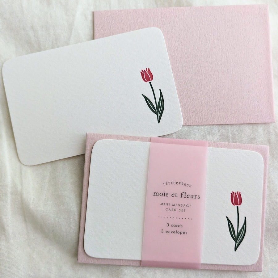 The mini cards "tulip" are letterpress printed in two colors and contain envelopes in colors that match the image of the flowers.