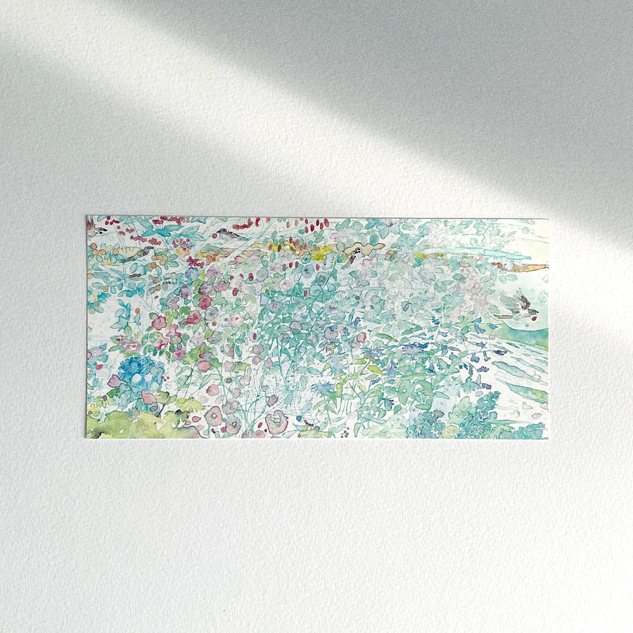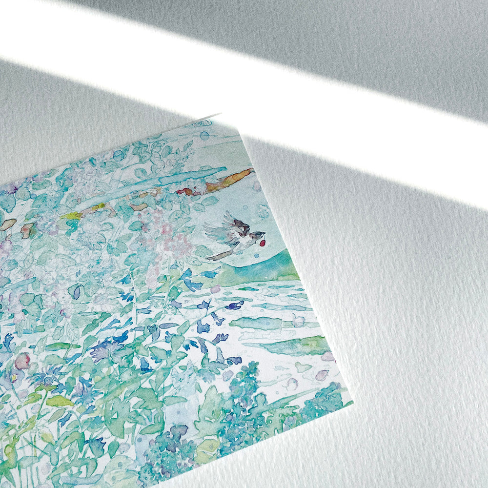 温かに包まれるような景色が広がる作品です。お手紙として使ってももちろん美しいですが、ポストカードというより、もはやアートなこの作品。