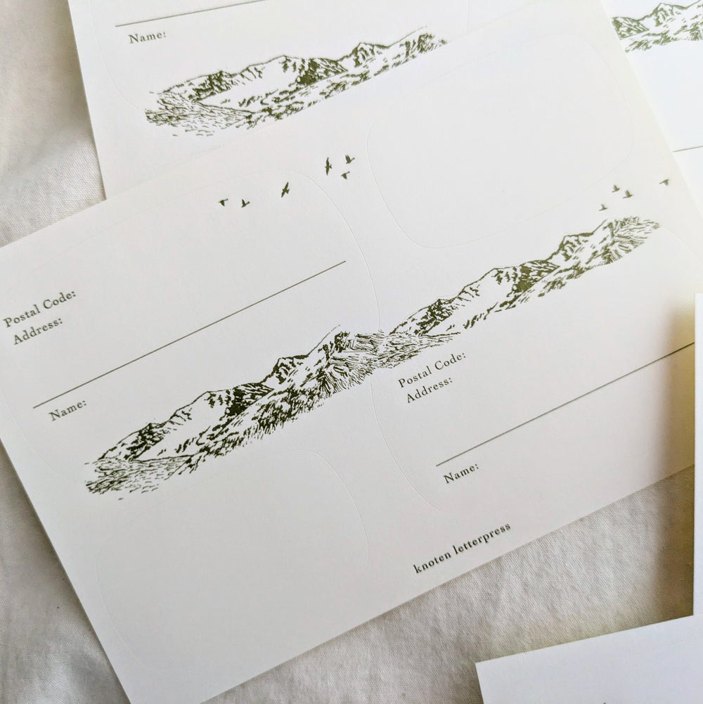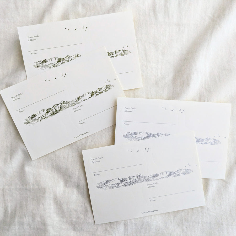 山がデザインされた宛名シールと、ブランクの差出人シールが2枚ずつで1シートになっています。